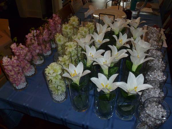 My centerpieces were the most difficult to plan and budget. I knew I was not going with real flowers. My $250 budget did not allow for it. Yes, $250. I had to strategize and research how I wanted all this to come together. Pinterest was extremely helpful but became overwhelming. I continued to “pin” all kinds of centerpieces but when it was time to purchase vases and flowers, I didn’t know what to do. I finally found Afloral.com and Save-on-Crafts.com. I bought an array of spring like flowers for the reception (42 vases) and the ceremony (2 tall vases). In addition, I added some pearls on the bottom of the vases. I purchased the vases by the dozen from the dollar store. I ended up with too many flowers but I have sold some of the vases and flowers through Craigslist and broke even. I went a little over budget at $290.