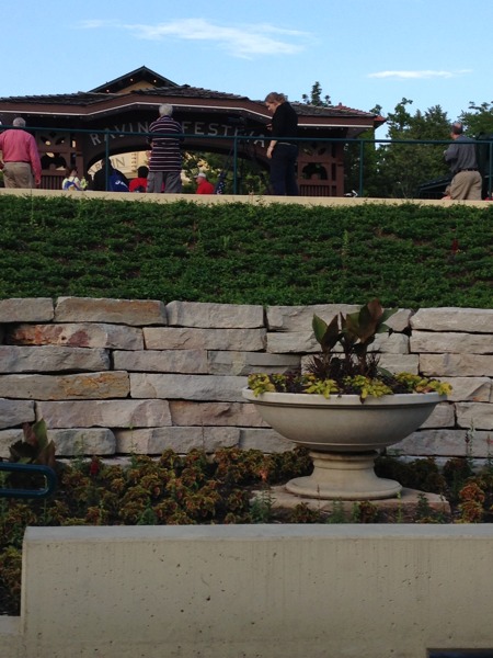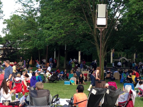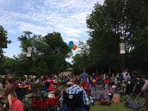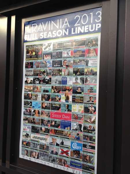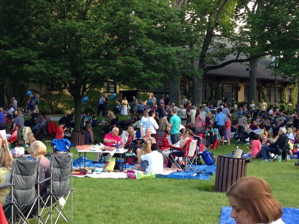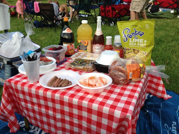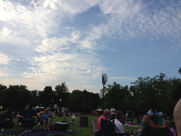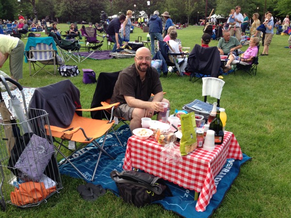 Our adventure for this weekend brings us to Ravinia Park to see the Mormon Tabernacle Choir and Orchestra. I’ve been looking forward to this since the weather has been mild and I absolute enjoy the picnic setup and music. My husband and I usually purchase lawn seats for $17 each, so we can have our fancy picnic setup on the lawn. We opt to take the Metra Rail for $7 each round trip instead of driving since its quite a trip out, about 21 miles north outside Chicago. Since its very inexpensive to get to Ravinia, I go all out on the food, bringing a variety of cheeses, beef tenderloin, shrimp cocktail, fruit, bread, and of course, sangria, champagne, and juice. We are not alone in the fanciness of picnic setups; our picnic neighbors have added candles and crystals to their tables.